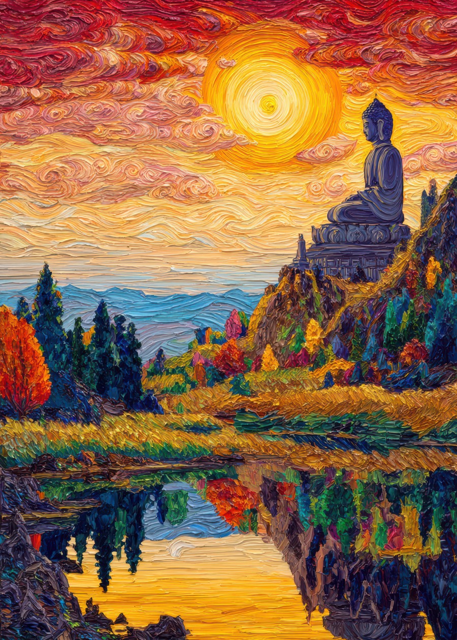 A Buddha sits atop a mountain, surrounded by vibrant, colorful brush strokes.