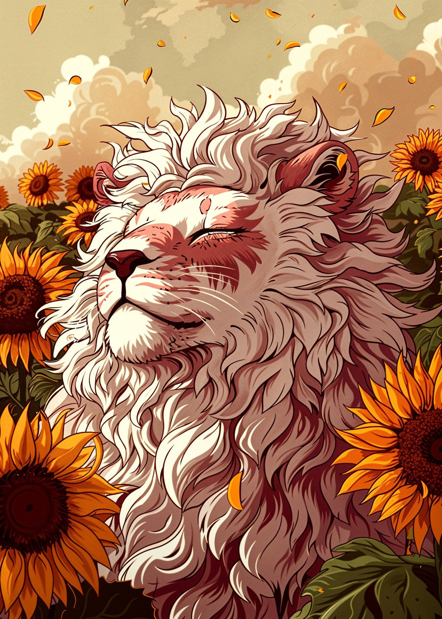 A majestic white lion basks peacefully among golden sunflowers, radiating calm and summer energy.