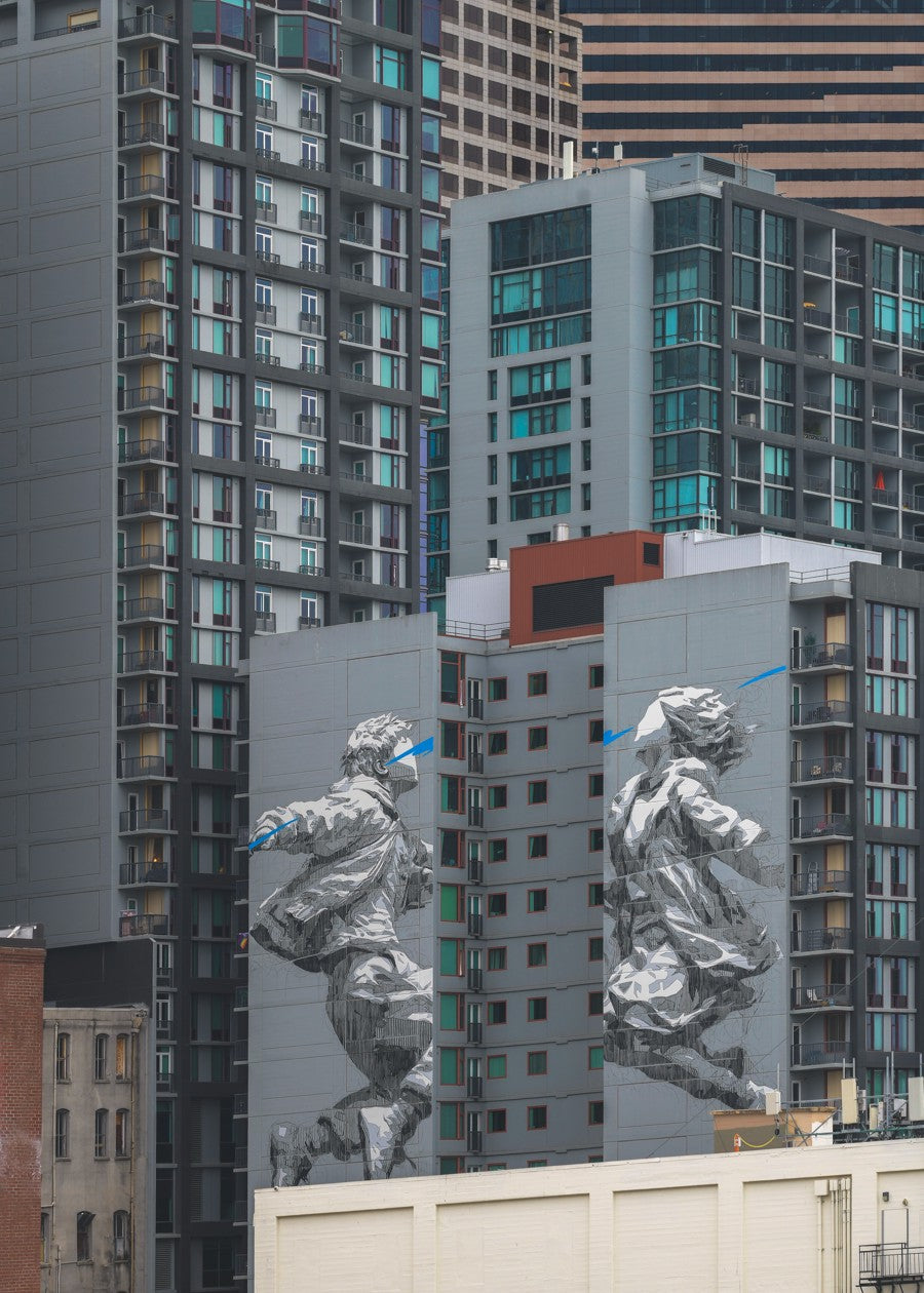 Urban skyscrapers dominate the cityscape, with striking murals of two dancers painted on adjacent building facades.