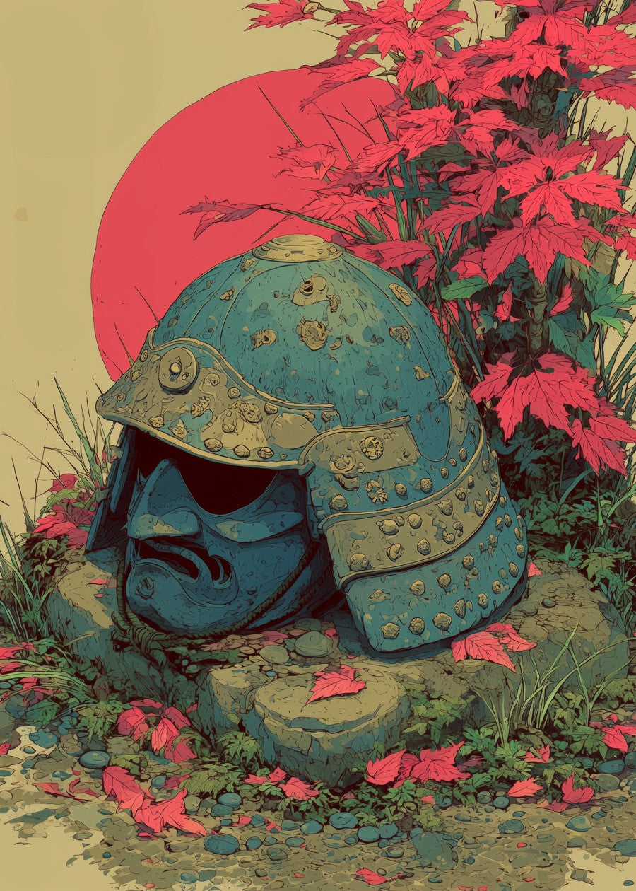 A modern ukiyo-e style illustration of a samurai's kabuto (helmet) and menpo (mask) resting on stones, set against a large crimson sun.