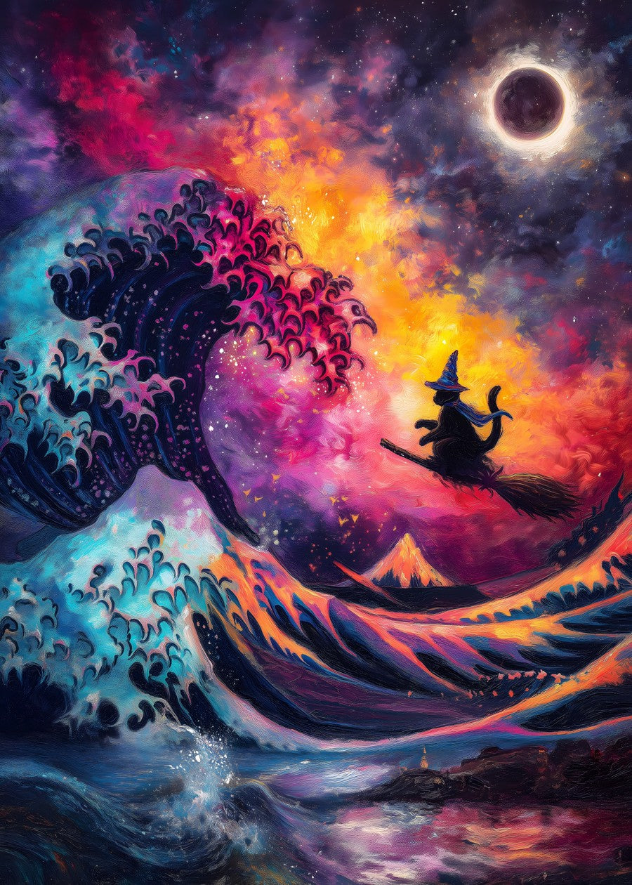 A witch on a broomstick flies over surreal waves under a vibrant, eclipsed sky.