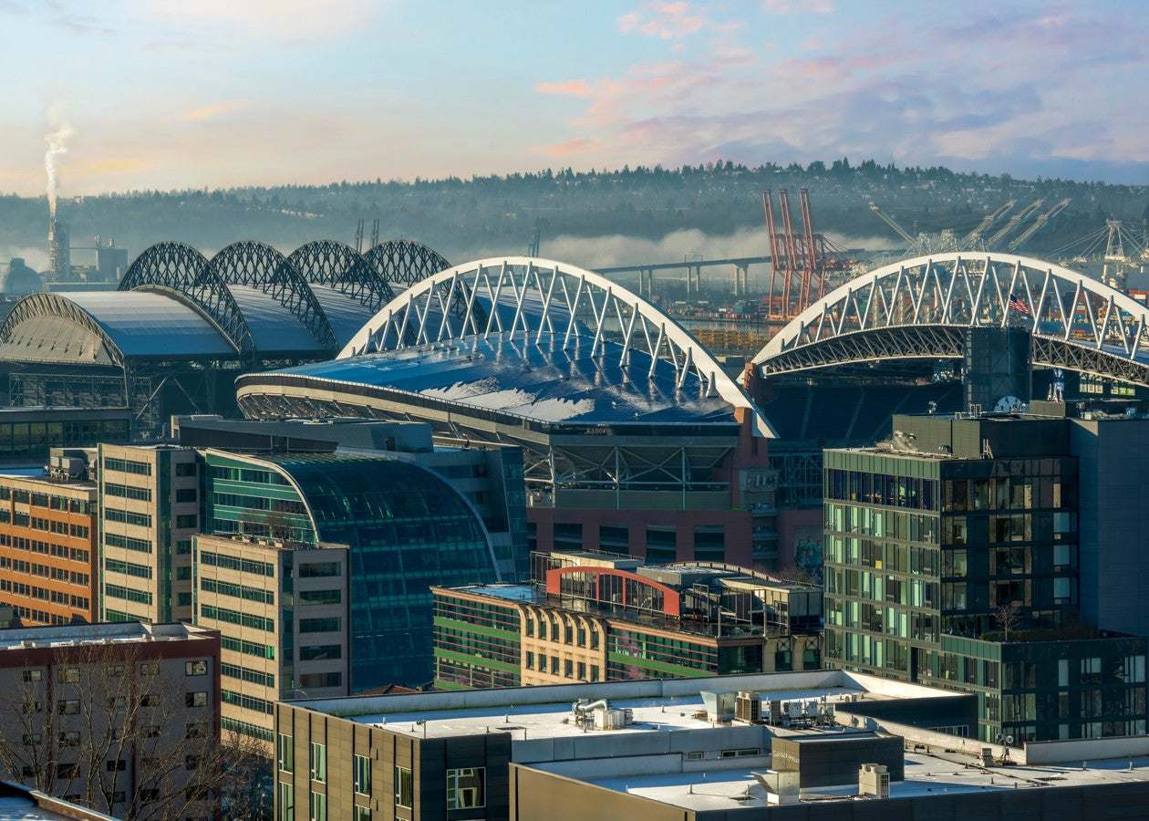 The image captures a panoramic view of the Seattle skyline, showcasing a cluster of modern buildings and stadiums.