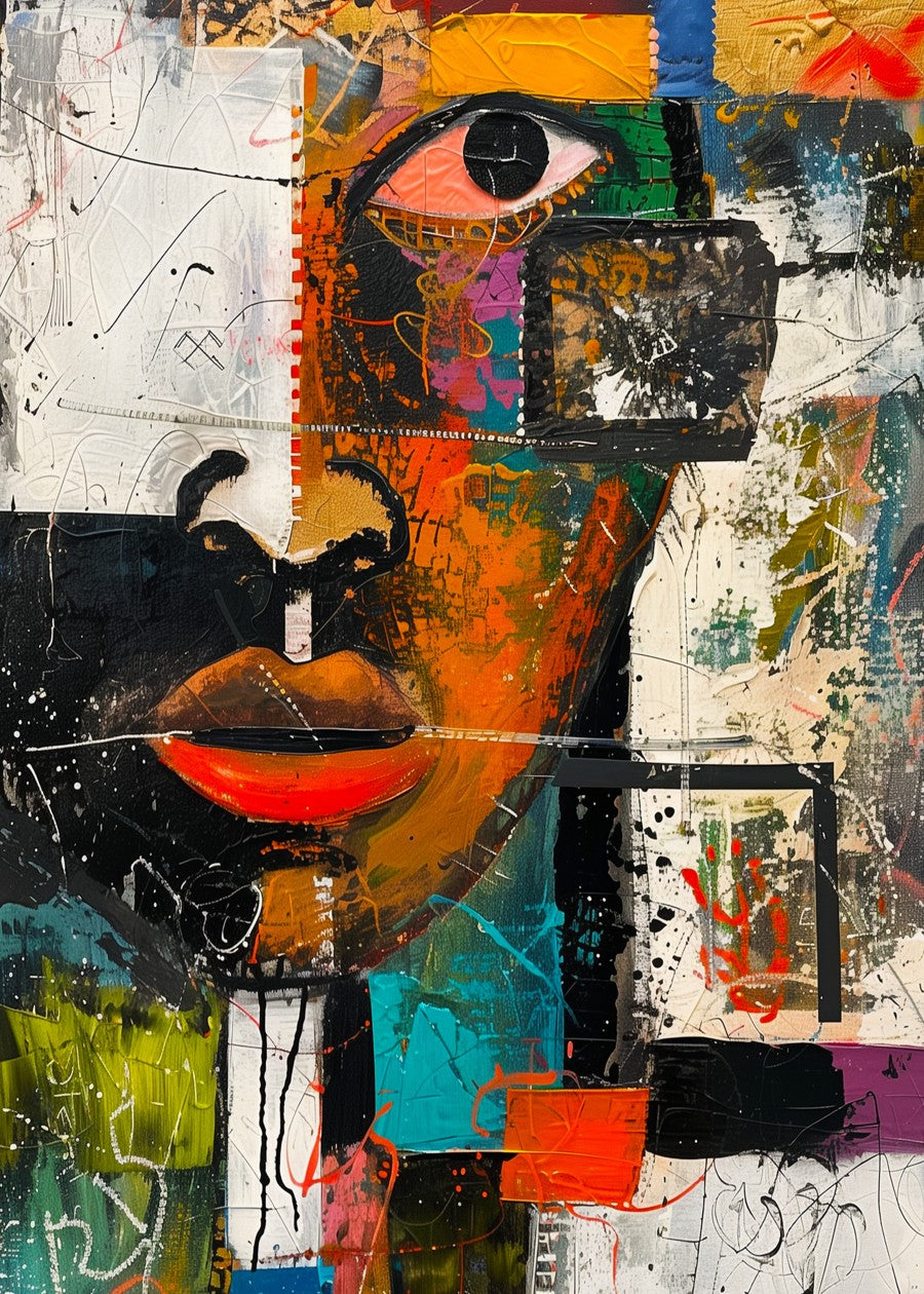 A fragmented portrait blending cubism, graffiti, and vibrant paint to reveal emotion in layers.
