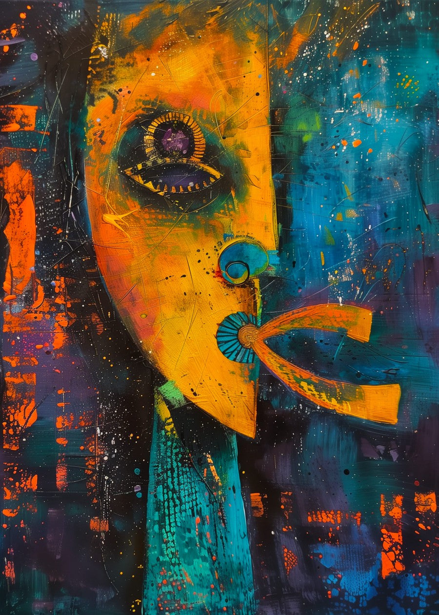 A vivid fusion of tribal expression and surreal abstraction, featuring bright colors and curious facial geometry.