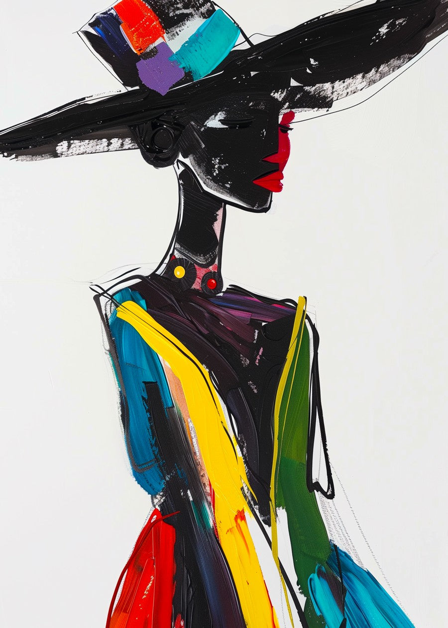 Stylish woman in a bold hat and flowing colors captured in expressive abstract brushstrokes.