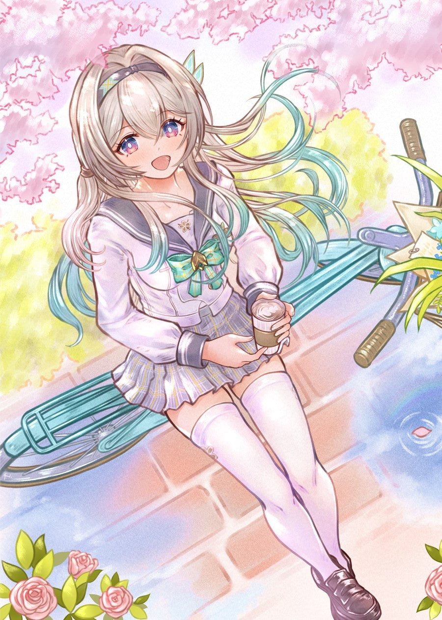 Anime school girl enjoying a sunny spring day under cherry blossoms. She's sitting on a turquoise bicycle, holding a cup of coffee.