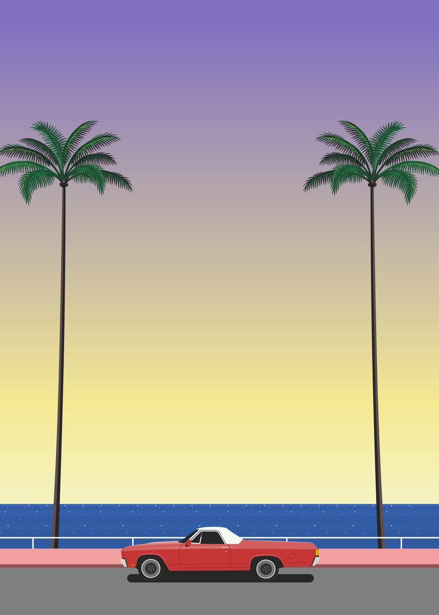driving in the afternoon with a classic car, with a view of the beach and coconut trees. hiroshi nagai retro style