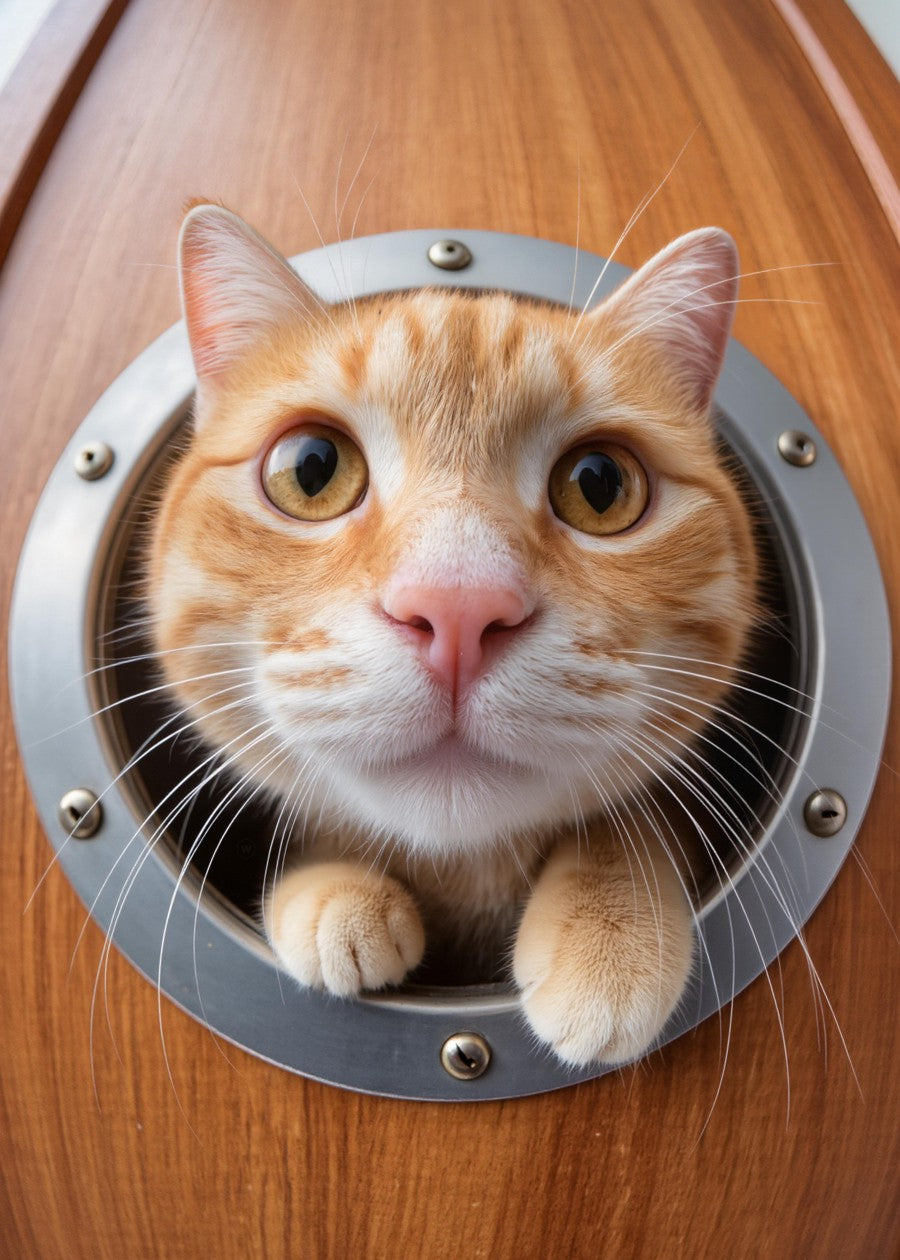 A wide-eyed, ginger tabby cat with an expressive face peers intently through a metal porthole in a wooden door, ready for adventure!