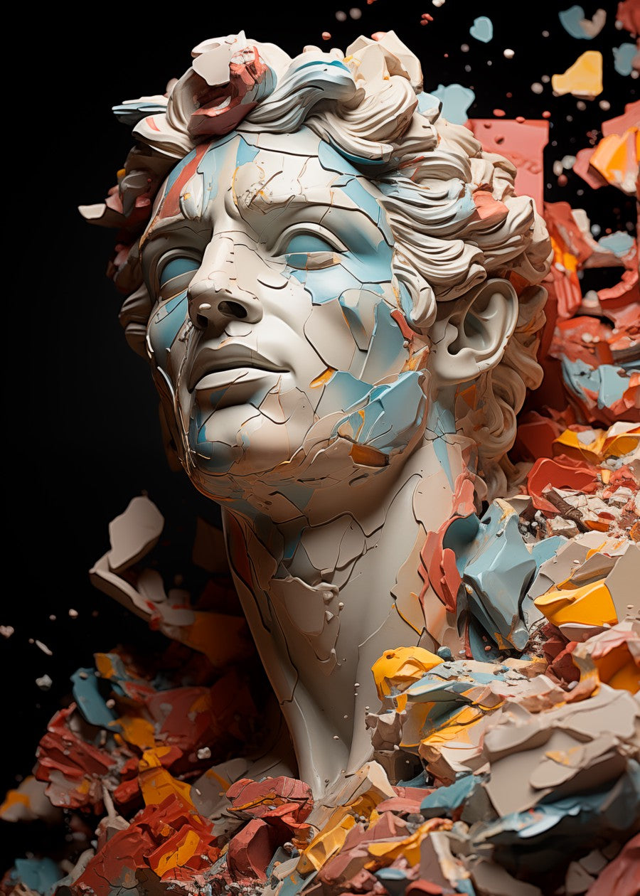 Shattered visage of Alexander the Great, fragments exploding in a dynamic burst of colour against darkness.