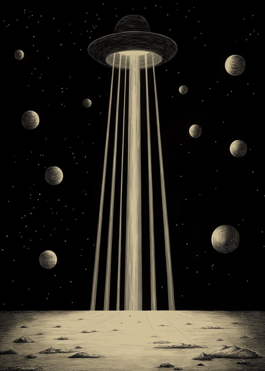 A vintage-style illustration of a flying saucer hovering over a desolate moonscape, emitting powerful beams of light for an abduction.