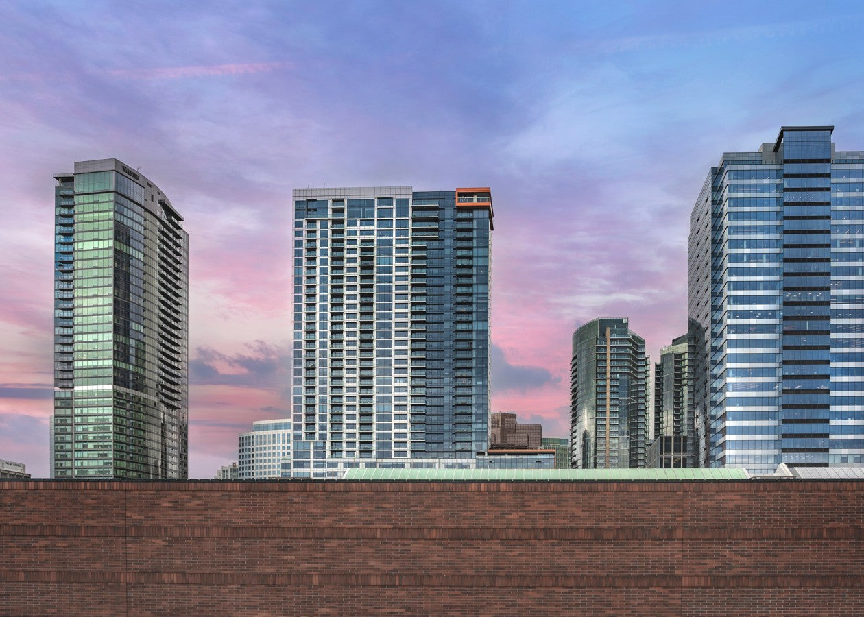 This scene shows the different glass front buildings. The red brick facade at the lower front is from the mall parking lot.