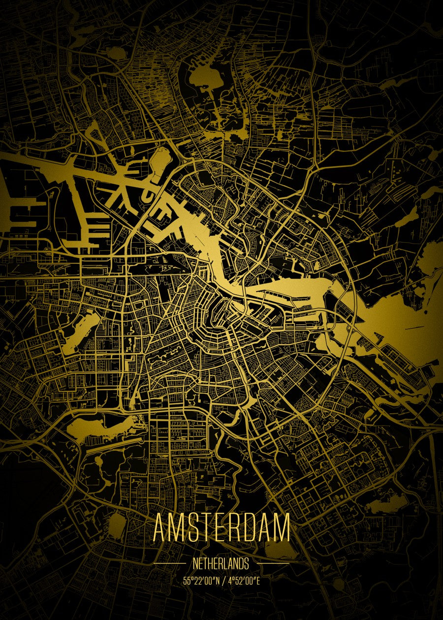 Amsterdam detailed shiny gold city map with lights lines and a dark background, showcasing the network of urban streets.