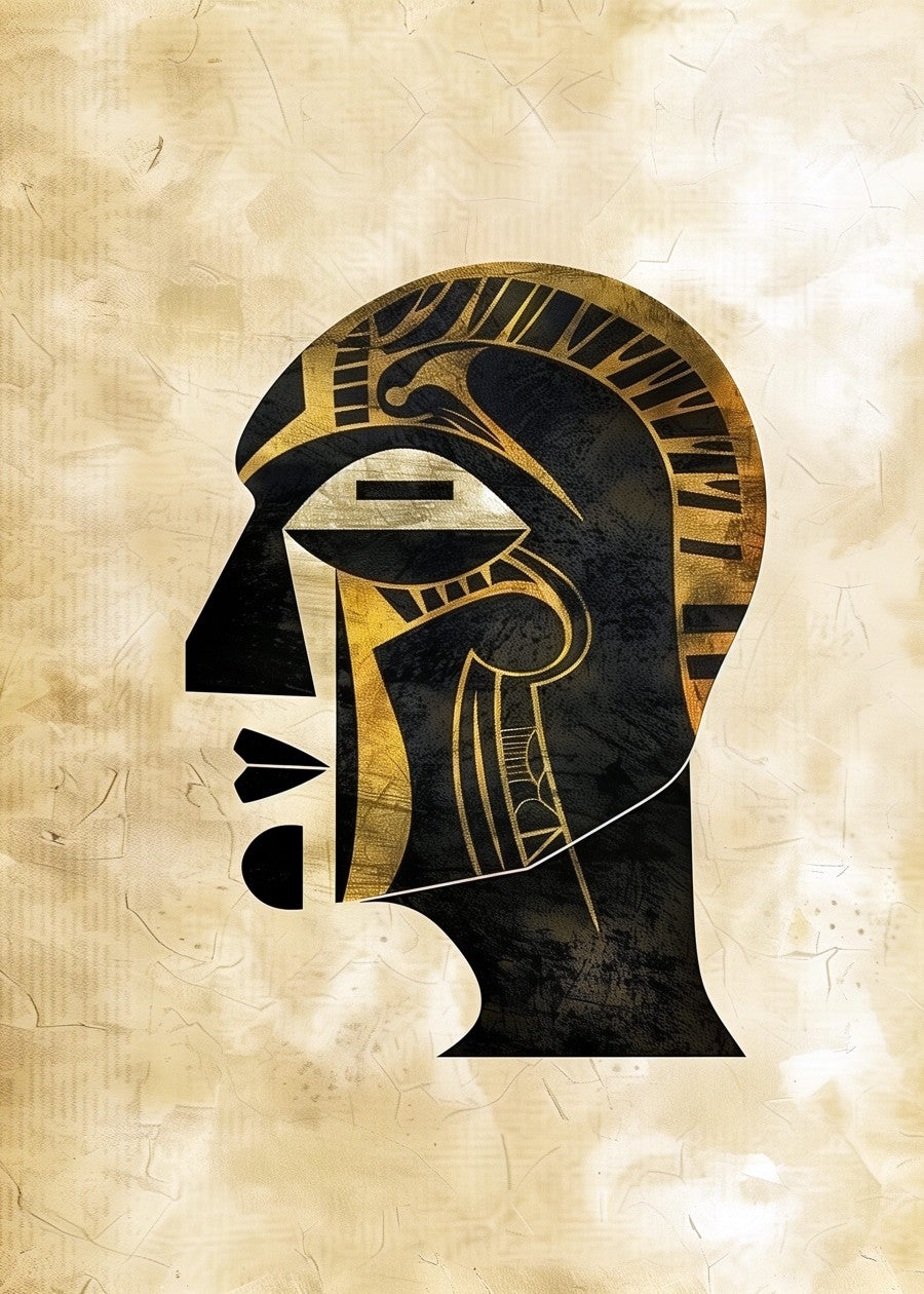 A striking tribal face in gold and black, symbolizing ancestral wisdom and spiritual legacy.