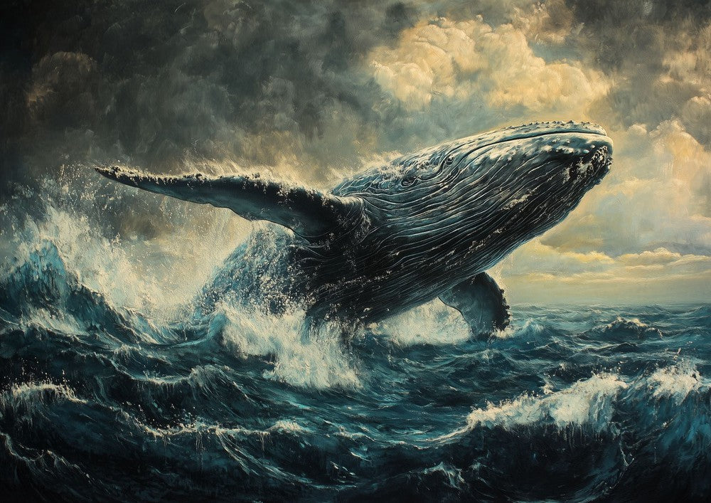 This awe-inspiring metal poster showcases an ancient whale gliding through the vast ocean, symbolizing the timeless beauty of the deep sea.