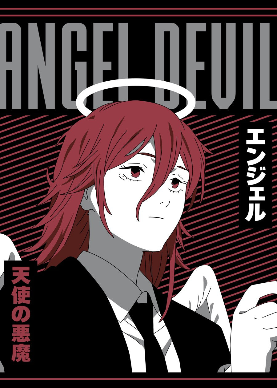 Elegant and haunting portrait of Angel Devil from Chainsaw Man. Minimalist design with dark tones and Japanese text. A fan-favorite piece.