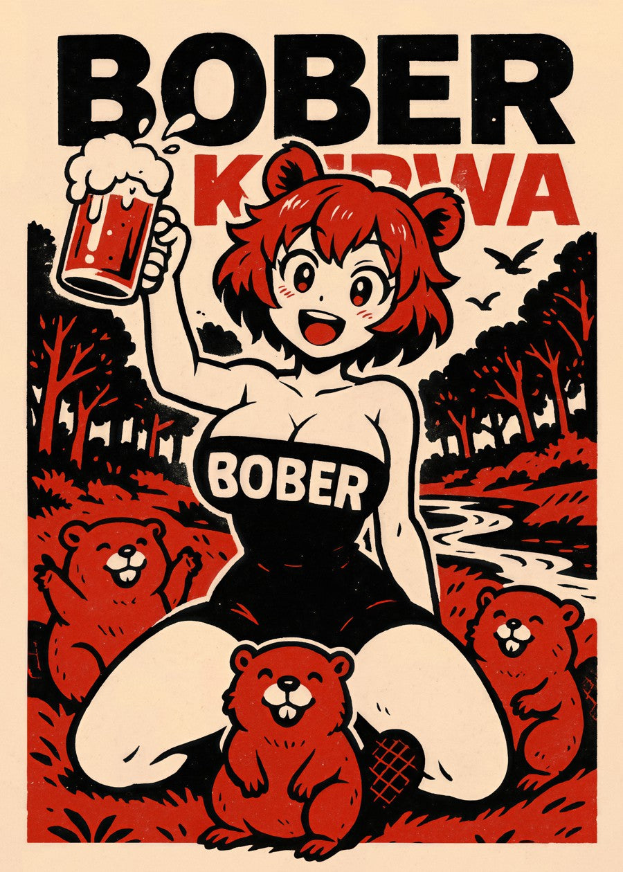 A playful mashup of boobs, beer, hentai waifu, and Bober the beaver. This weirdly sexy anime poster mixes Polish meme humor, cute animals, a