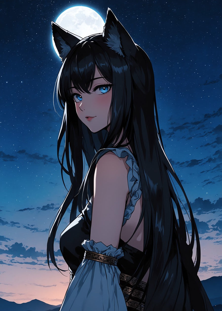 Sweet and mysterious anime girl in the dark of night