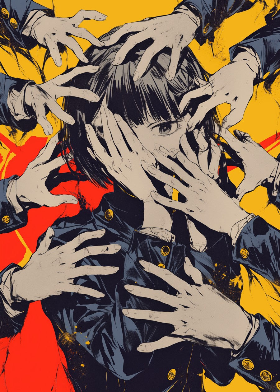 The image depicts an anime-style girl with short black hair, wearing a dark blue school uniform with gold buttons.
