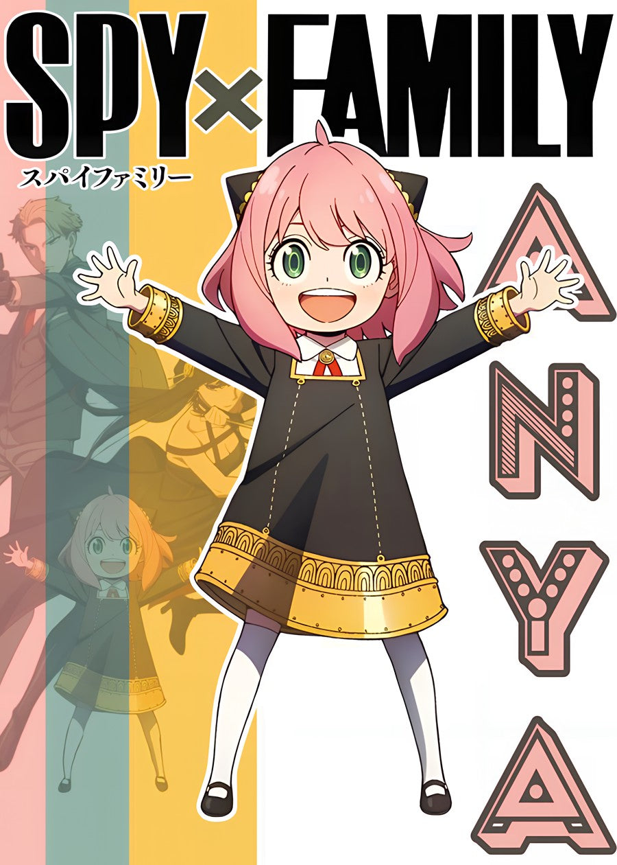 Anya Forger beams in her school uniform with Loid and Yor behind her, captured in a bright, stylish SPY x FAMILY design.