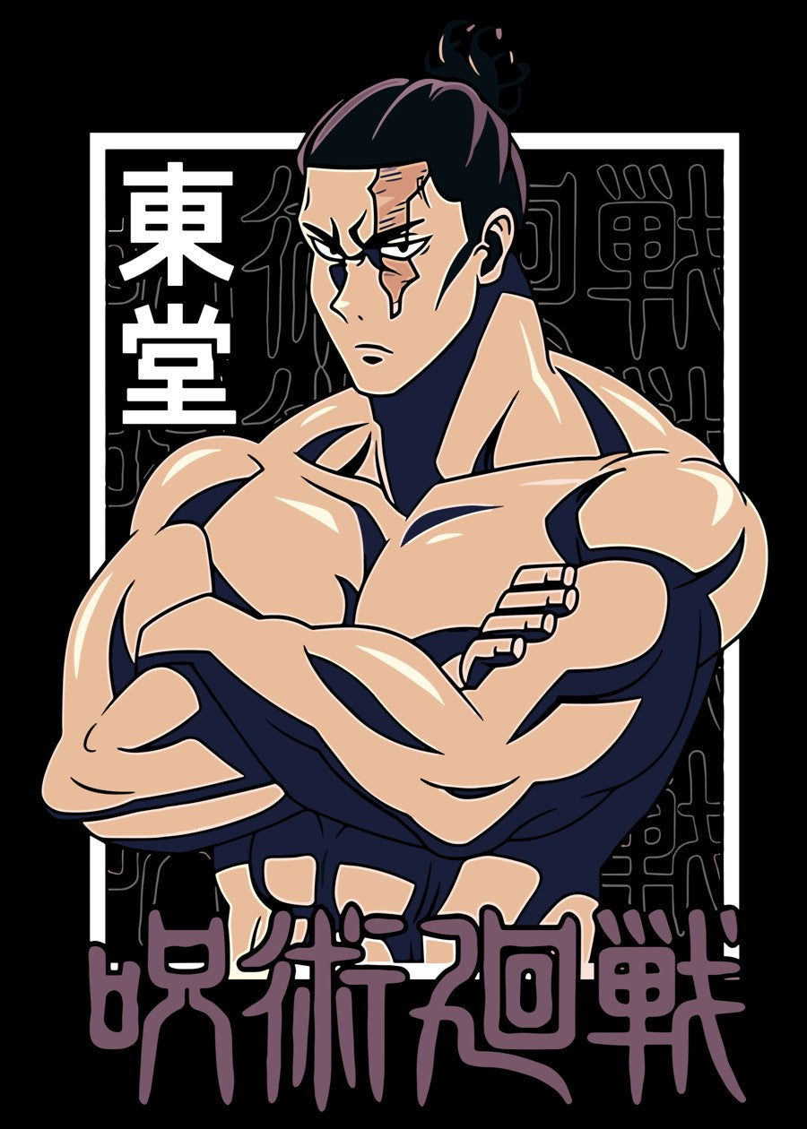 This striking artwork features Aoi Todo from Jujutsu Kaisen, standing with his arms crossed, radiating overwhelming strength and unshakable