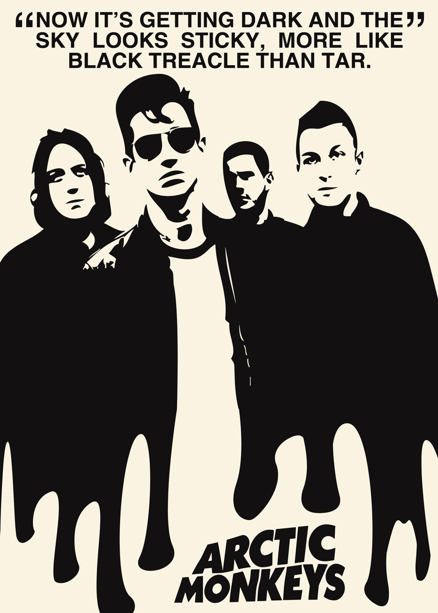 A stylish, silhouette-based poster of Arctic Monkeys with a prominent lyric from "Black Treacle."