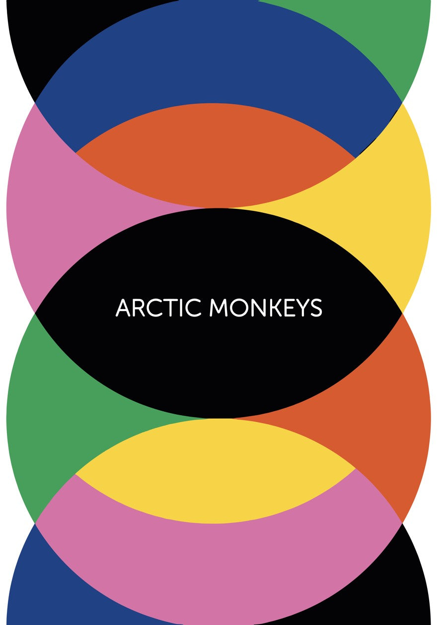 A colorful, abstract poster for Arctic Monkeys, featuring intersecting geometric circles with a clean black center displaying the band’s name.