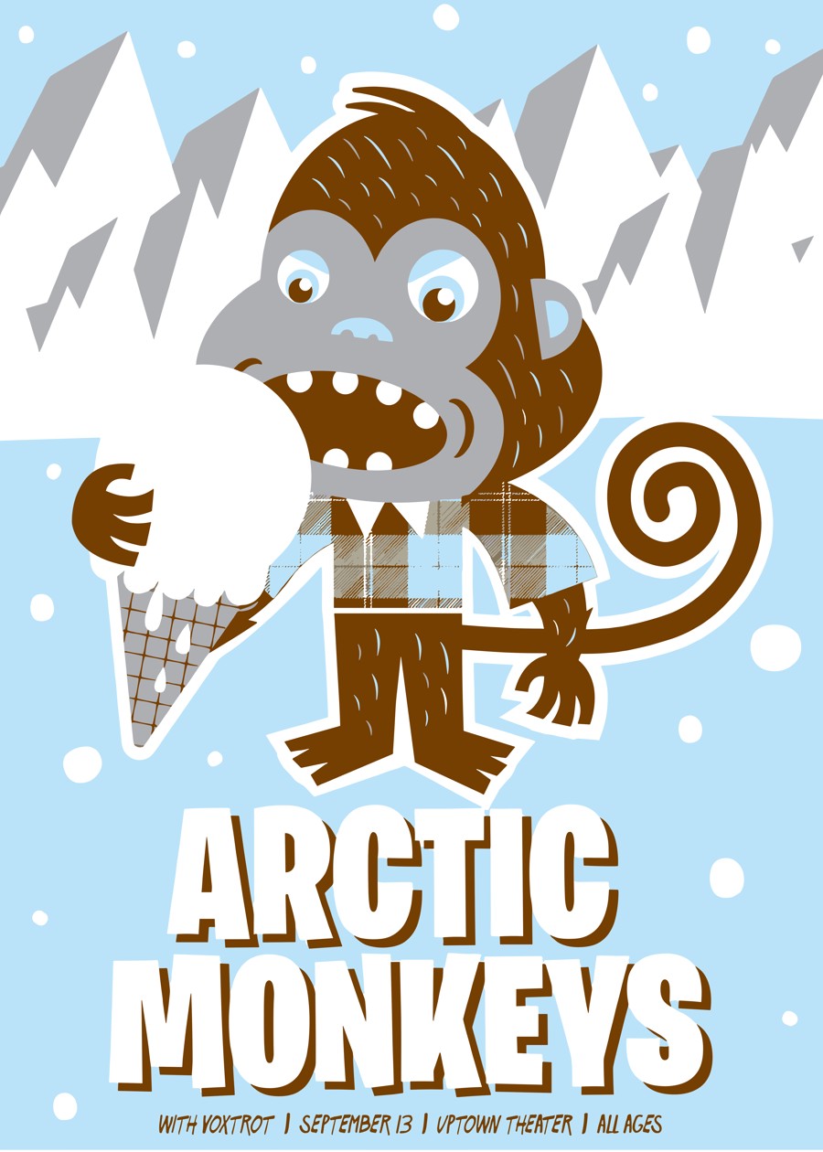 A playful, cartoon-style poster for an Arctic Monkeys concert. The central figure is a yeti character holding an ice cream cone with snowy m
