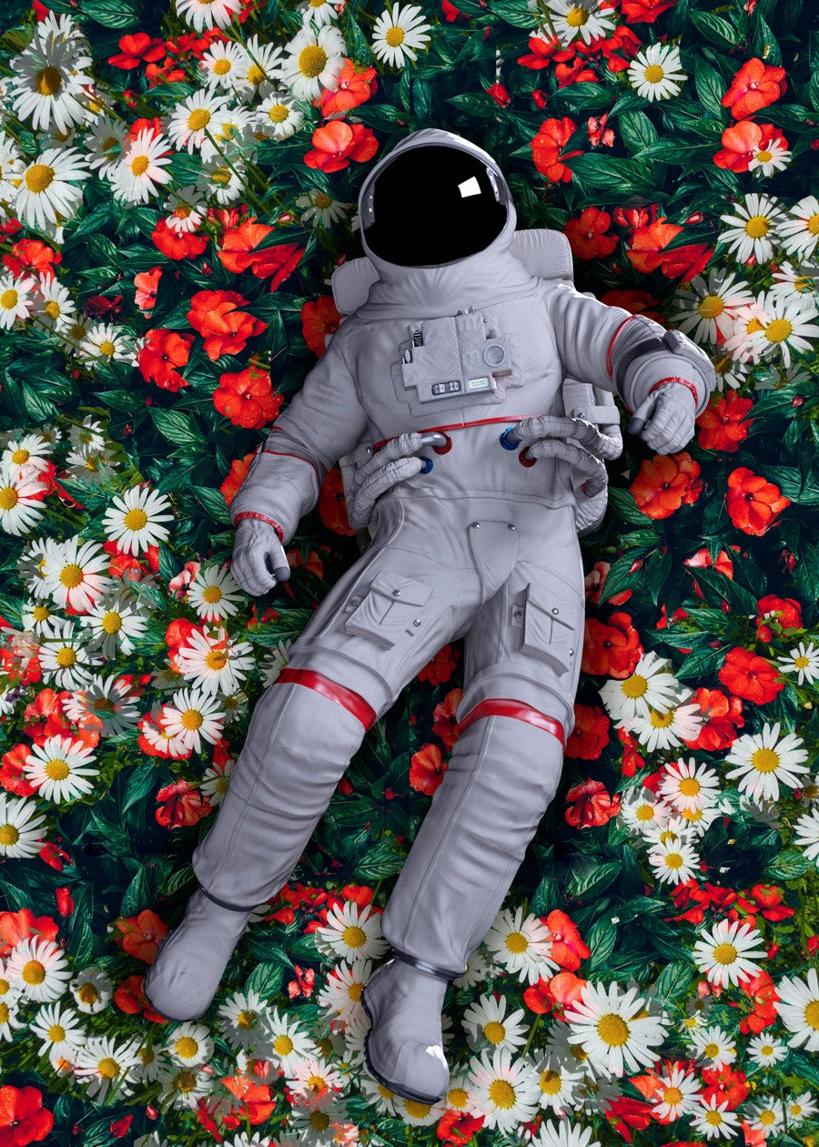 A striking surrealist image of an astronaut resting amidst a vibrant field of daisies and red flowers. Perfect for modern, bold wall art.