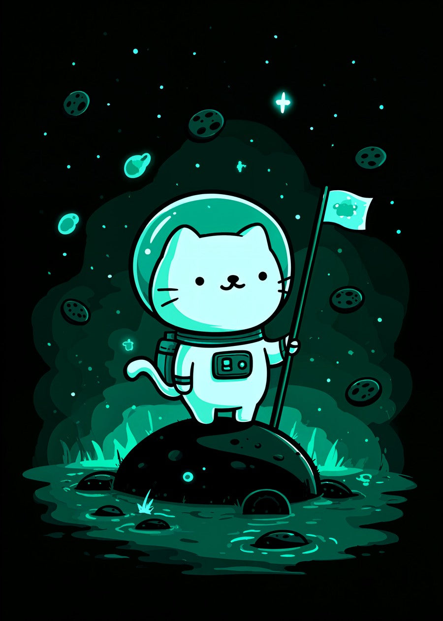 Brave space cat claims a glowing cookie planet with a cute flag. The perfect gift for cat lovers and space explorers!