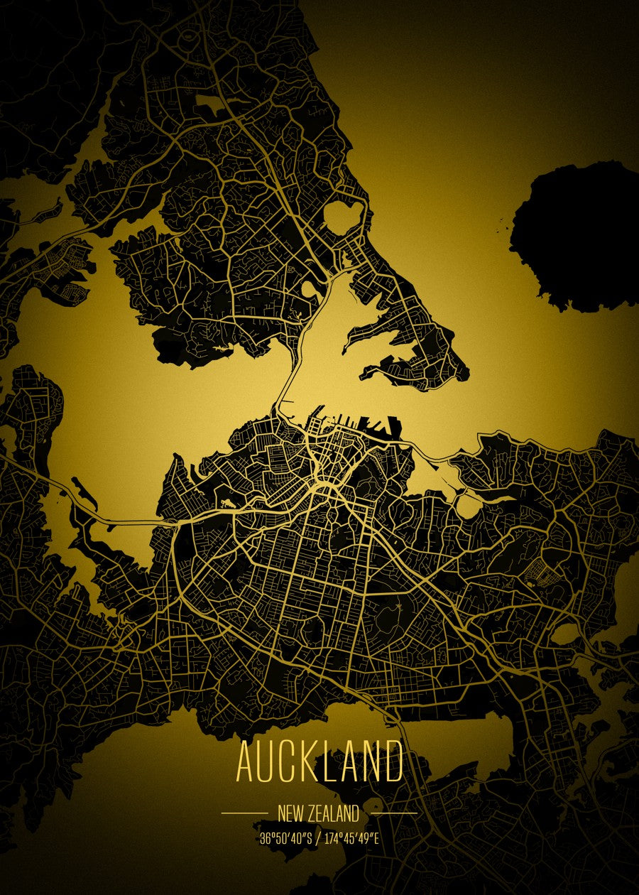 Auckland detailed shiny gold city map with lights lines and a dark background, showcasing the network of urban streets.