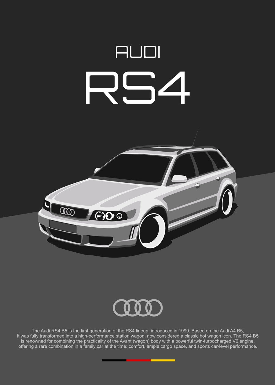 Audi RS4 B5, a legendary 90s wagon with extreme performance, powerful V6 engine, and the iconic sporty design of Audi’s RS lineup.