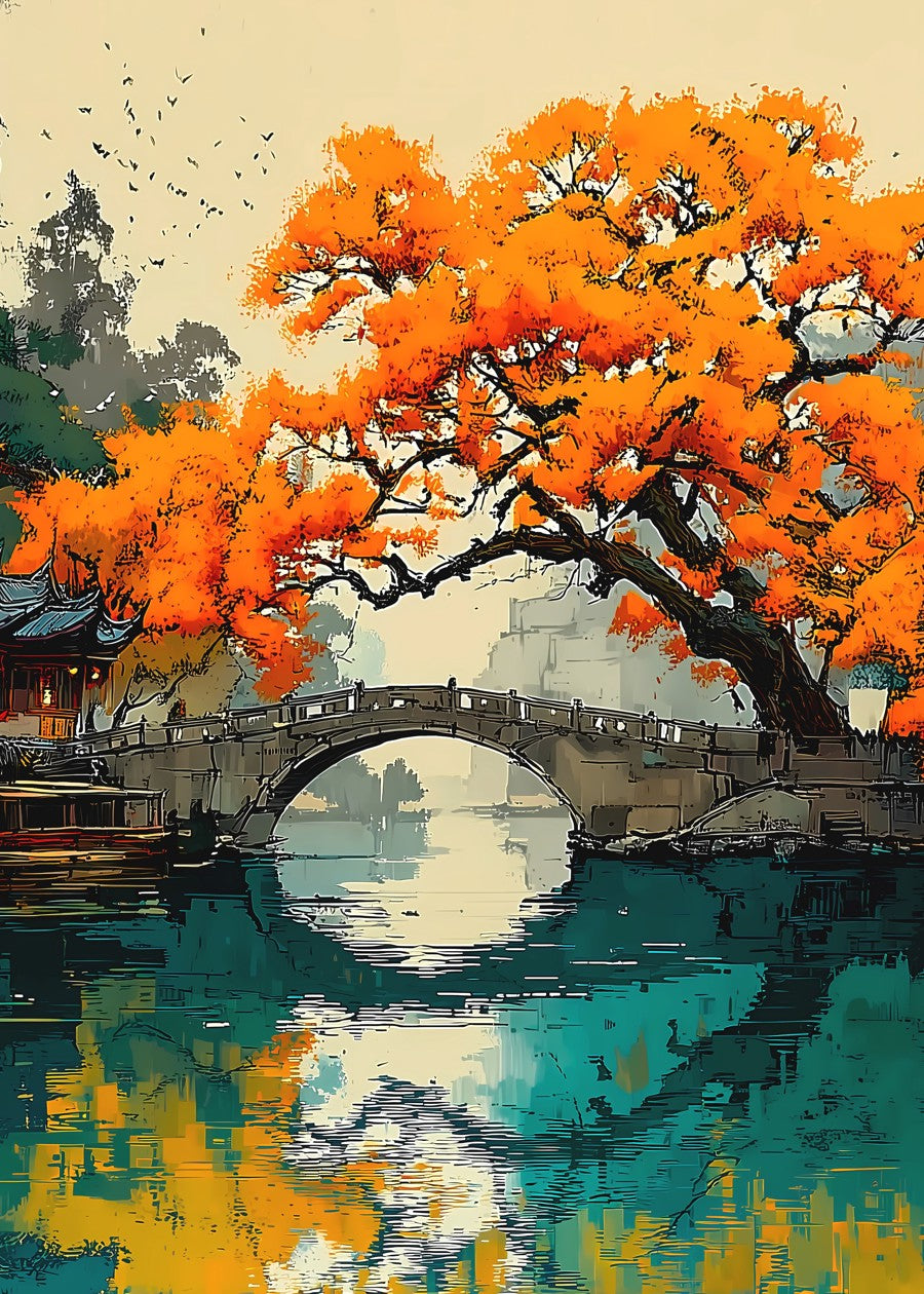 A stunning autumn scene in the style of traditional Japanese art with a vibrant orange maple tree arching gracefully over a reflective stone bridge.