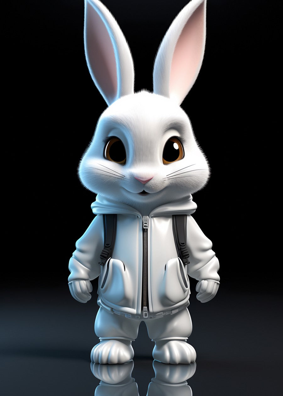 Urban Bunny. A stylized white rabbit figure in a crisp white hoodie and backpack, standing tall on a reflective dark surface.