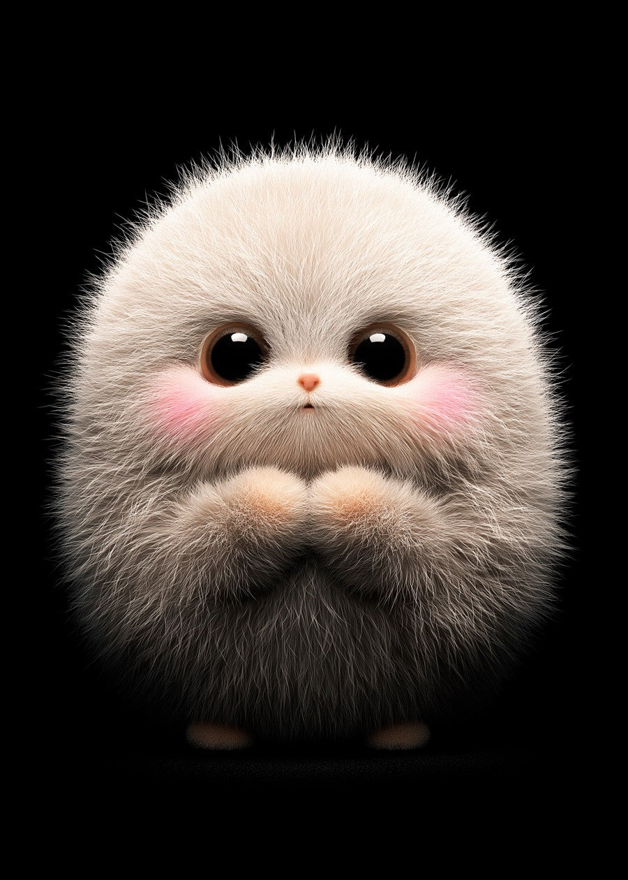 A highly detailed 3D rendering of a small, incredibly fluffy, beige creature with large, innocent eyes and rosy cheeks.