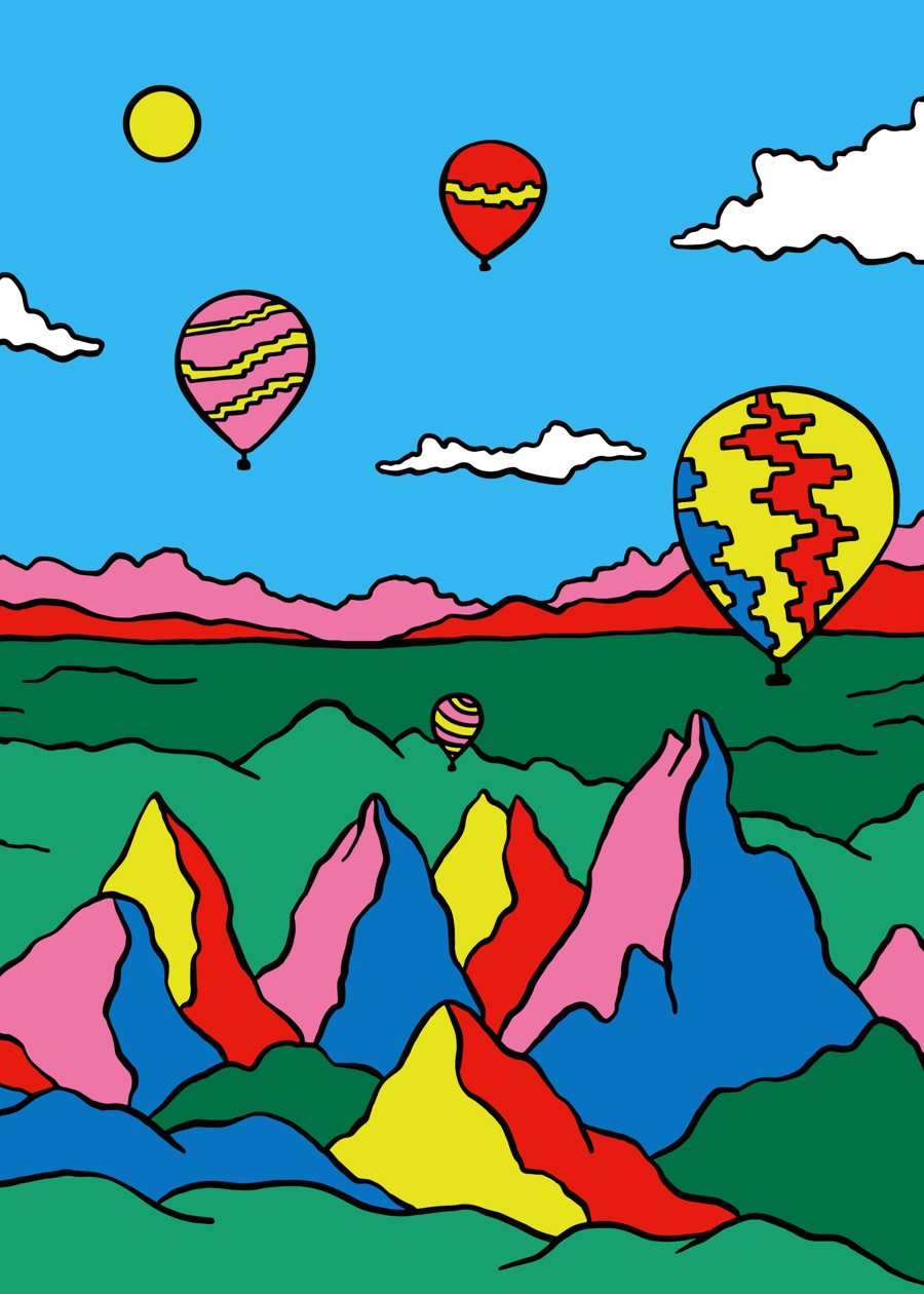 A colorful, whimsical landscape of hot air balloons floating over abstract mountains.