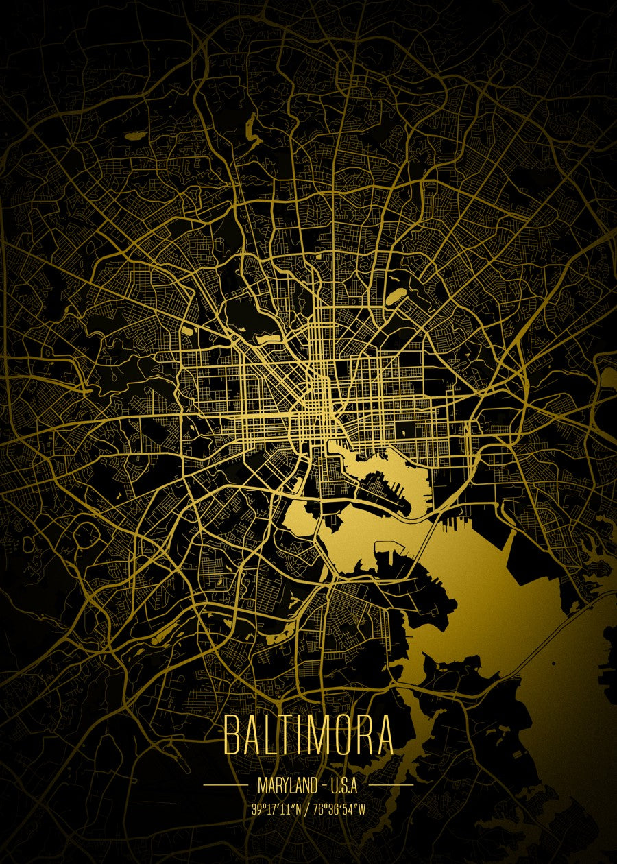 Baltimora detailed shiny gold city map with lights lines and a dark background, showcasing the network of urban streets.