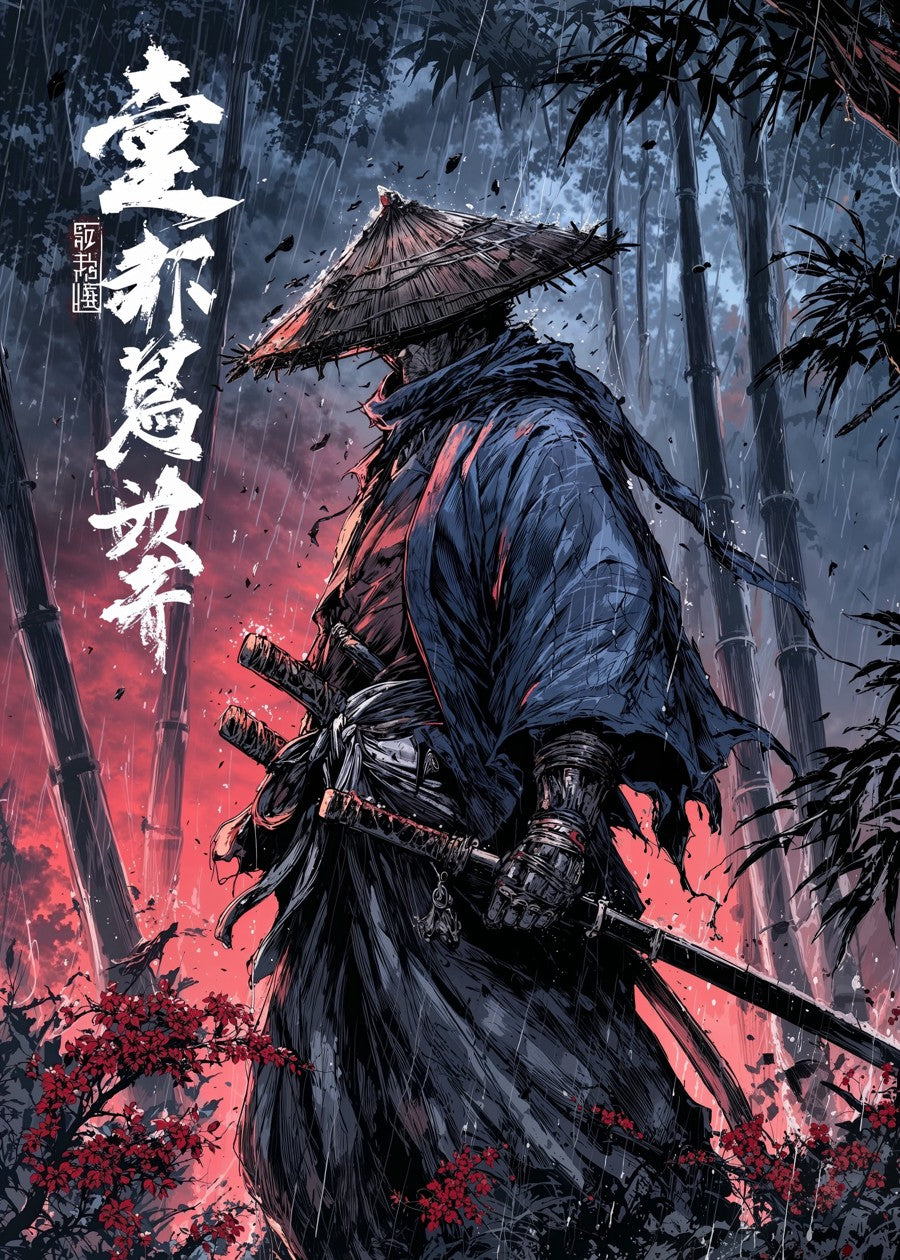 A lone ronin stands in the rain, surrounded by bamboo and blood-red light, his katana ready for the silent storm to come.