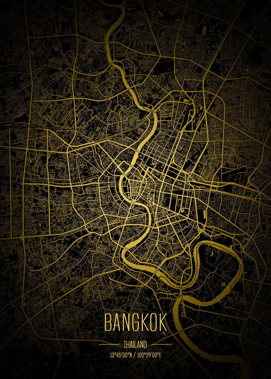 Bangkok detailed shiny gold city map with lights lines and a dark background, showcasing the network of urban streets.