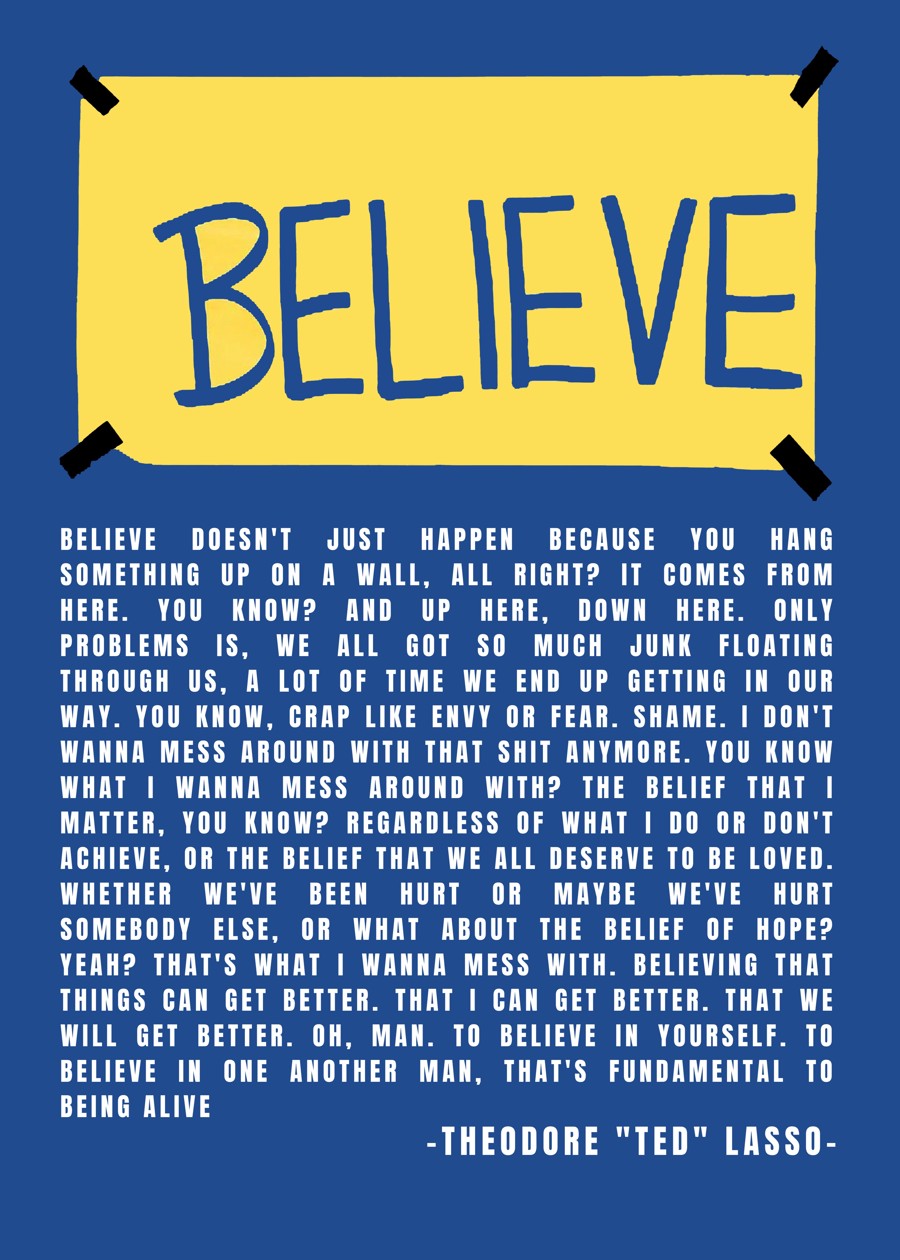 In the TV show Ted Lasso, the phrase "Believe" refers to a motivational sign Ted Lasso hangs in the locker room, representing his core tenets of hope, self-belief, and faith in others. The word also encapsulates the series' overall themes of optimism and the power of believing in oneself and a shared goal, even in the face of setbacks and cynicism.