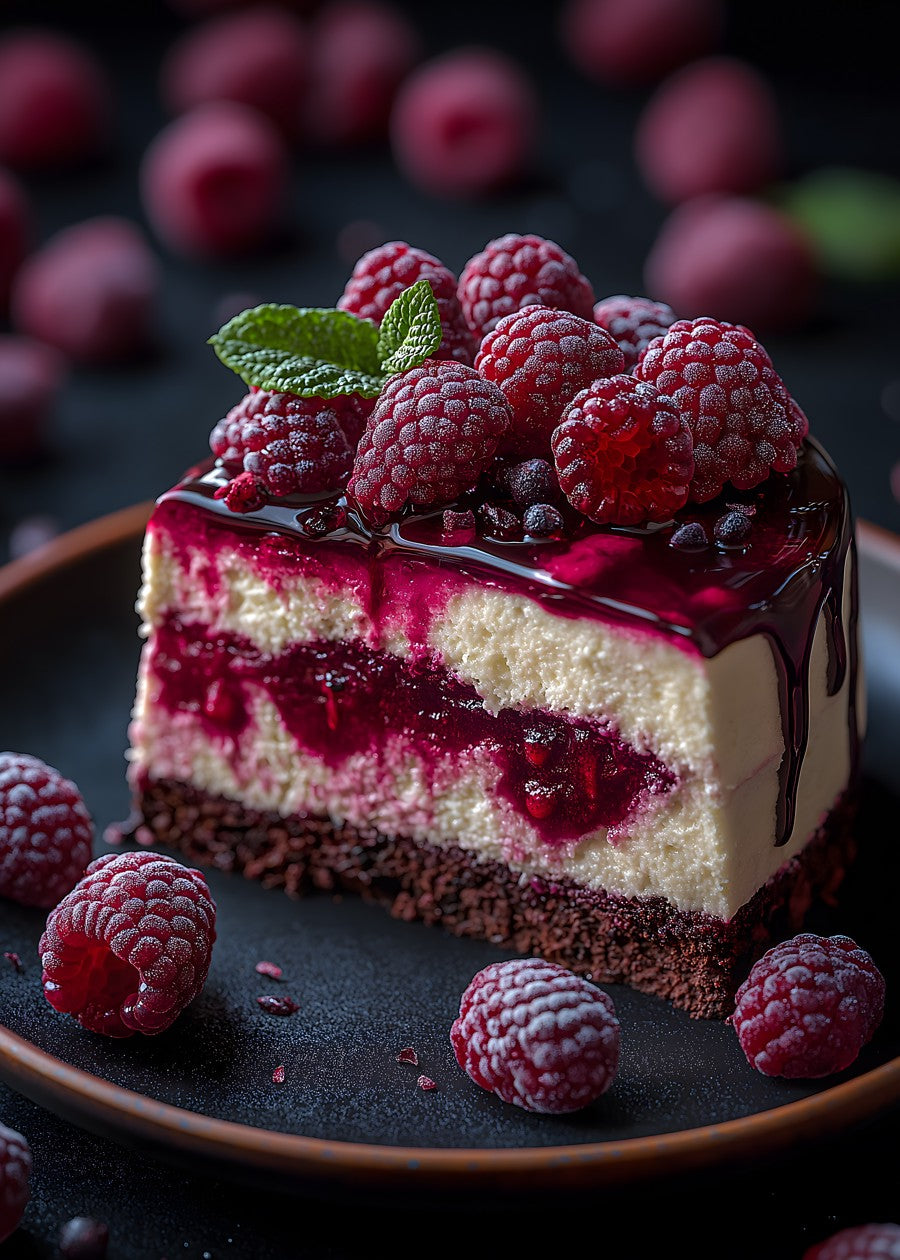 A tempting slice of cheesecake adorned with fresh raspberries and mint leaves—pure indulgence.