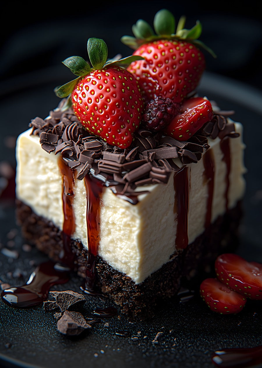 Decadent cheesecake topped with strawberries and chocolate shavings.
