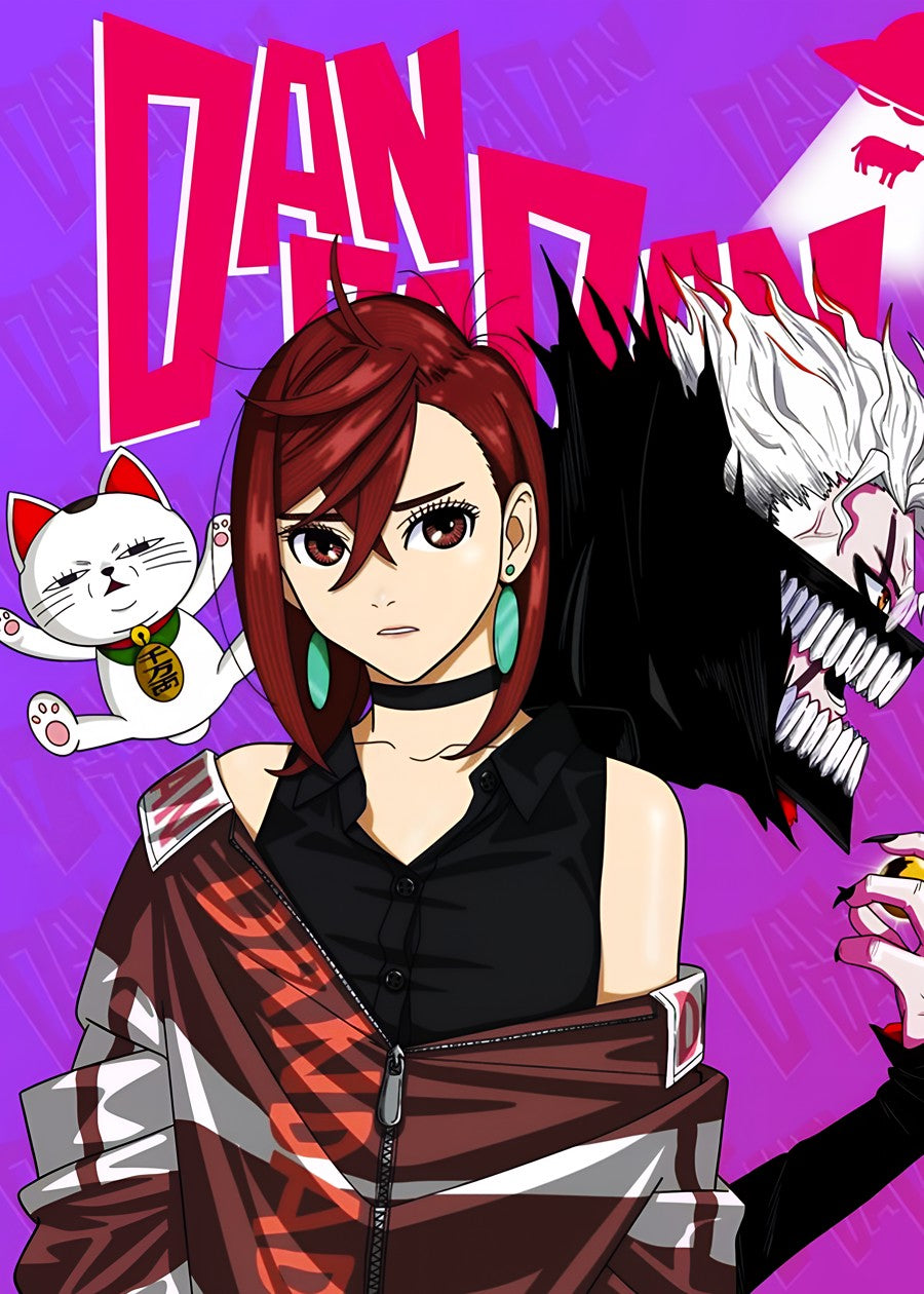 Momo Ayase stands tense as a shadowy monster looms behind her, a floating maneki-neko beside, under the bold “DANDADAN” title.