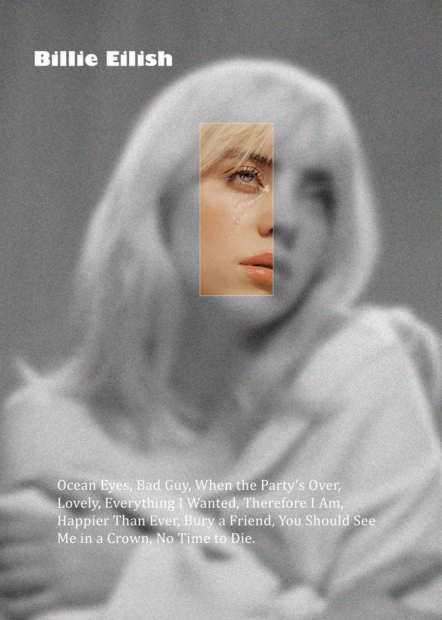 An artistic Billie Eilish design with a minimalist style and a striking close-up that reflects her unique personality