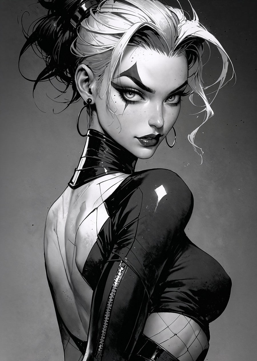 The image features a detailed illustration of a sexy female character rendered in black and white. She has short, white hair pulled back.