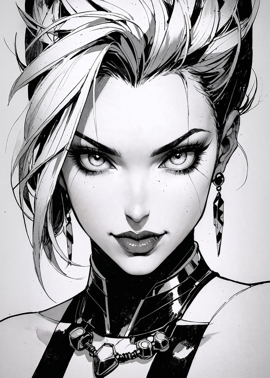 The image features a close-up portrait of a young woman with striking white hair styled in a sharp, edgy fashion.