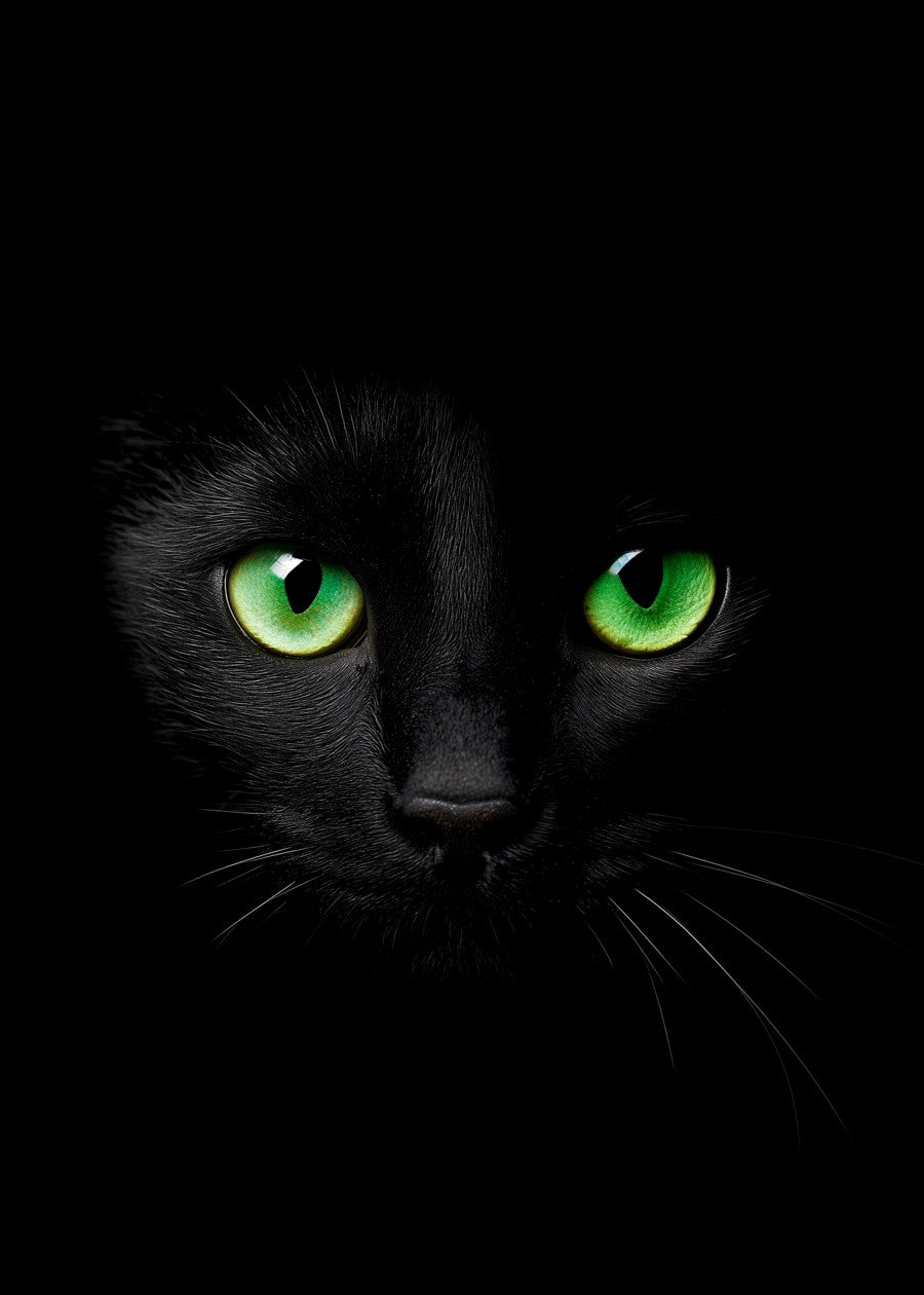 A black cat’s face emerges from the darkness, illuminated only by its striking, luminous green eyes. A hypnotic, mysterious gaze.