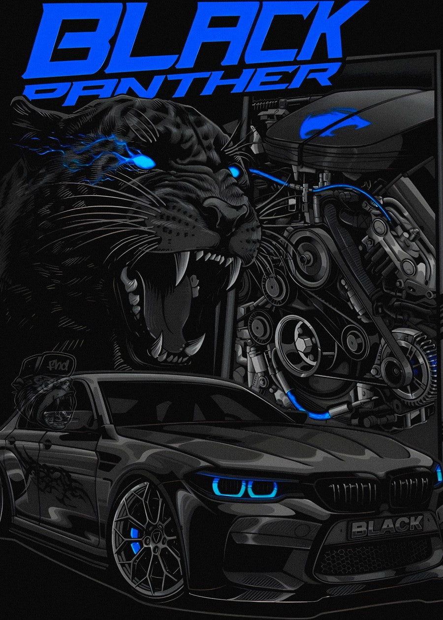 This image is a graphic style illustration that combines automotive elements and the symbol of a wild animal, namely the black panther.
