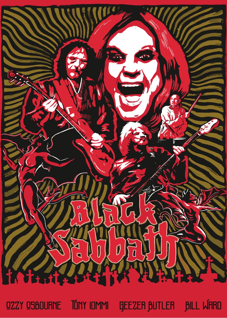 Dynamic band members surrounded by swirling patterns and cemetery motifs.
