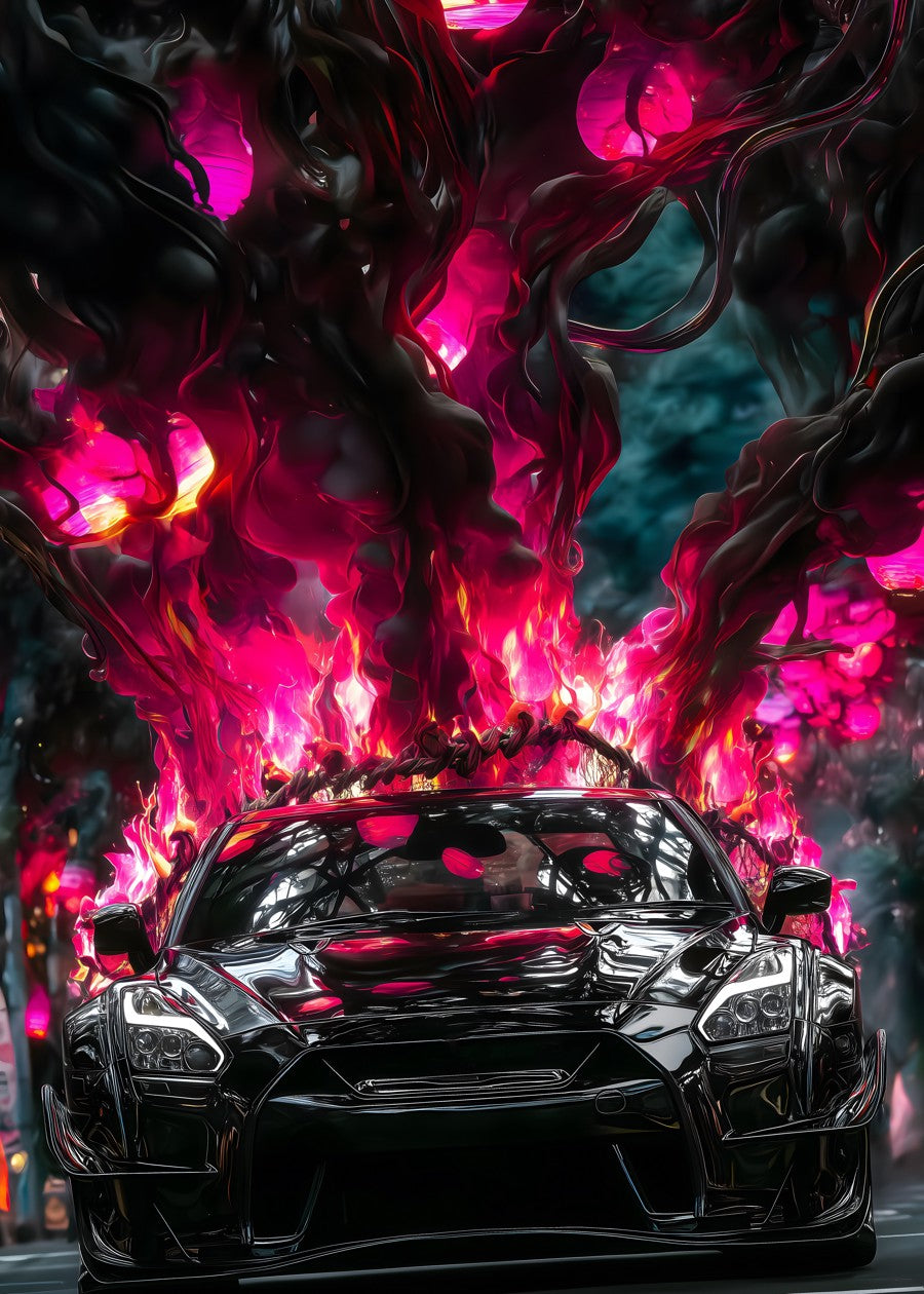 A sleek car engulfed in swirling pink flames and smoke, charging forward.