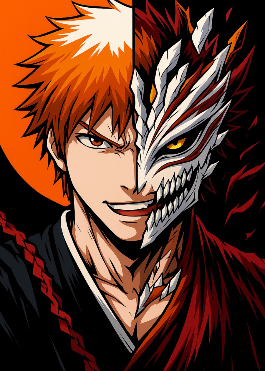 A powerful illustration of Ichigo Kurosaki from Bleach, showcasing his dual nature as a Soul Reaper and his fearsome Hollow form.